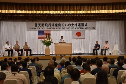 普天間飛行場東側沿いの土地返還式典・祝賀会が開催されました 7月31日に普天間基地東側沿いの土地が返還されたことに伴い、本市と沖縄防衛局共催による返還式典及び祝賀会が開催され、宮澤防衛大臣政務官をはじめとする関係者や地元… 続きを読む >